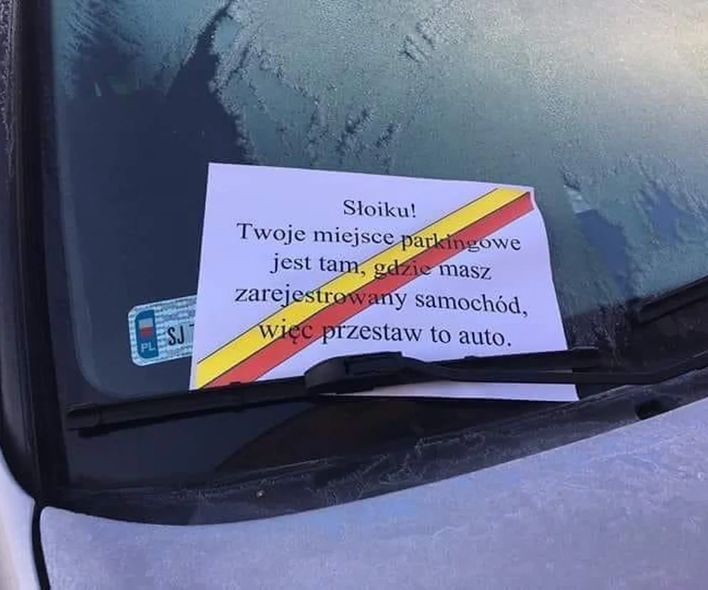 Mieszkańcy całej Polski zapowiadają zemstę za słynną już kartkę. Jednemu z kierowców oberwało się za śląską rejestrację. - Słoiku! Twoje miejsce parkingowe jest tam, gdzie masz zarejestrowany samochód, więc przestaw auto – głosił napis pozostawiony za wycieraczką. Wiele wskazuje na to, że teraz może nastąpić zmasowany odwet.