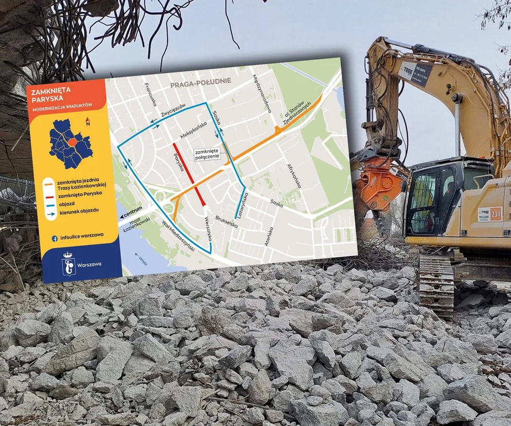 Jednak żeby pozbyć się wysłużonej konstrukcji, trzeba najpierw zamknąć ruch pod nią. – W nocy z niedzieli na poniedziałek, z 16 na 17 marca, drogowcy zamkną przejazd Paryską pod Trasą Łazienkowską. Od ul. Zwycięzców kierowcy dojadą tylko do skrzyżowania z Meksykańską. Dalej wjadą wyłącznie mieszkańcy budynków położonych tuż przy Trasie. Z kolei po drugiej stronie znaki zakazu ruchu staną już na rondzie Wolframa. Z Wersalskiej i Brukselskiej w Paryską pojadą tylko mieszkańcy. Objazd zostanie wyznaczony ulicami Zwycięzców, Saską i Lotaryńską lub Wałem Miedzeszyńskim. Na Paryskiej, pod wiaduktem, nie przejdą także piesi. Na drugą stronę Trasy Łazienkowskiej można się dostać przy Wale Miedzeszyńskim lub wiaduktem na ulicy Saskiej – informują urzędnicy.