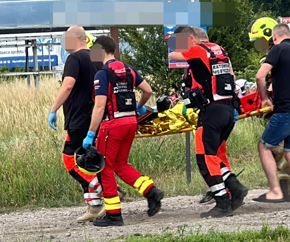 Skutki wypadku był koszmarne. Motocyklista i jego pojazd przelecieli kilkadziesiąt metrów. W klika minut po wypadku na miejsce dotarła pomoc. Motocyklista odniósł ciężkie rany, m.in. nogi. Z nieoficjalnych źródeł wiemy, że może stracić jedną z dolnych kończyn. Ratownicy udzielili mu pierwszej pomocy, po czym szybko przetransportowali rannego do śmigłowca. Mężczyzna stracił w międzyczasie przytomność.