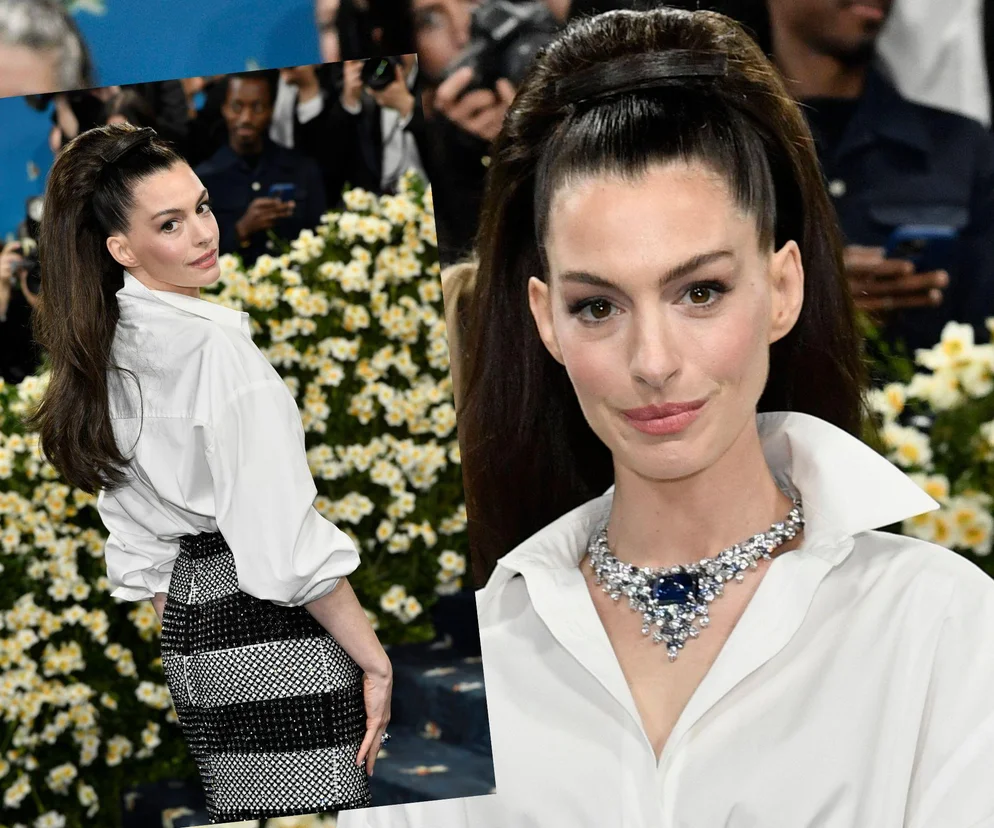 Na uwagę zasługuje również kreacja Anne Hathaway. Aktorka miała na sobie białą koszulę oraz spódnicę w błyszczące pasy - to projekt Caroliny Herrery. Z kolei w biżuterii postawiła na projekt marki Bvlgari. Naszyjnik z ogromnym kamieniem robił wrażenie i świetnie wpasował się do elegnackiej stylizacji.