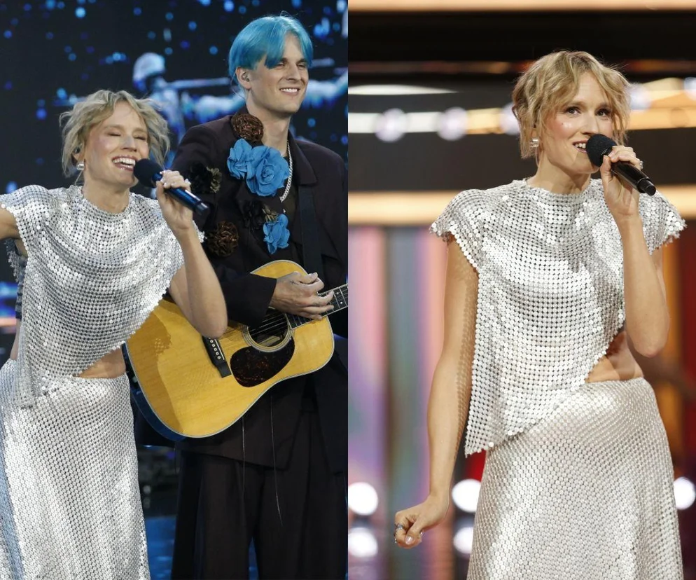 Bovska wystąpiła bowiem w zestawie składającym się z długiej spódnicy z wysokim stanem, do której dopasowano luźny, ale kusy top. Całość została wykonana z drobnych srebrzystych kółeczek, nic więc dziwnego, że niektórym przywodziła na myśl rycerską kolczugę.