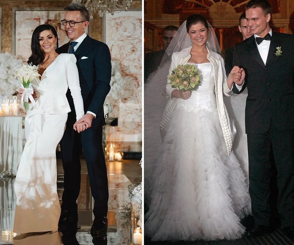 Drugi ślub - który wzięła 25 października 2025 roku - to już nowoczesna kreacja od Violi Piekut. Katarzyna Cichopek i Maciej Kurzajewski pochwalili się w sieci zdjęciem, na którym Kasia pozuje w dwuczęściowym, białym komplecie - bluzka o kroju przywodzącym na myśl marynarkę i długa, wąska spódnica z drapowaniem z przodu. Kwiaty tym razem wybrała białe i rozpuściła włosy, podczas gdy na pierwszym ślubie miała je upięte z welonem, który na drugim sobie odpuściła.