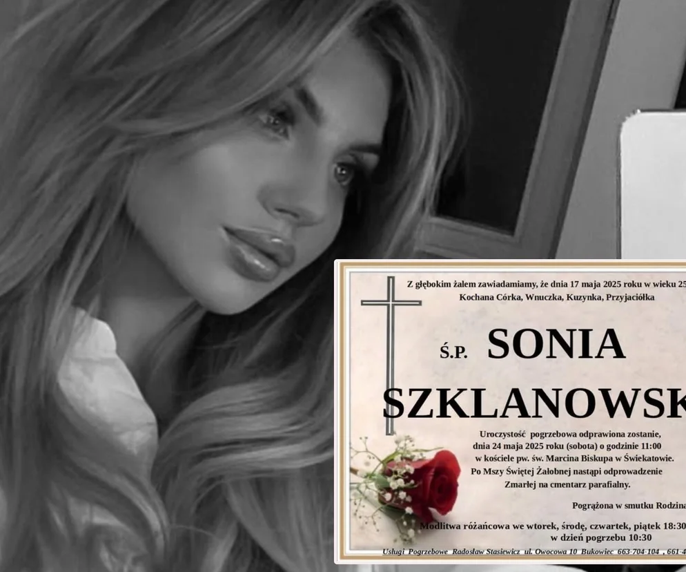 Z głębokim żalem zawiadamiamy, że dnia 17 maja 2025 r. w wieku 25 lat zmarła Kochana Córka, Wnuczka, Kuzynka, Przyjaciółka Ś.P. Sonia Szklanowska. Uroczystość pogrzebowa odprawiona zostanie dnia 24 maja 2025 r. (sobota) o godz. 11:00 w kościele pw. św. Marcina Biskupa w Świekatowie. Po Mszy Świętej Żałobnej nastąpi odprowadzenie Zmarłej na cmentarz parafialny.
