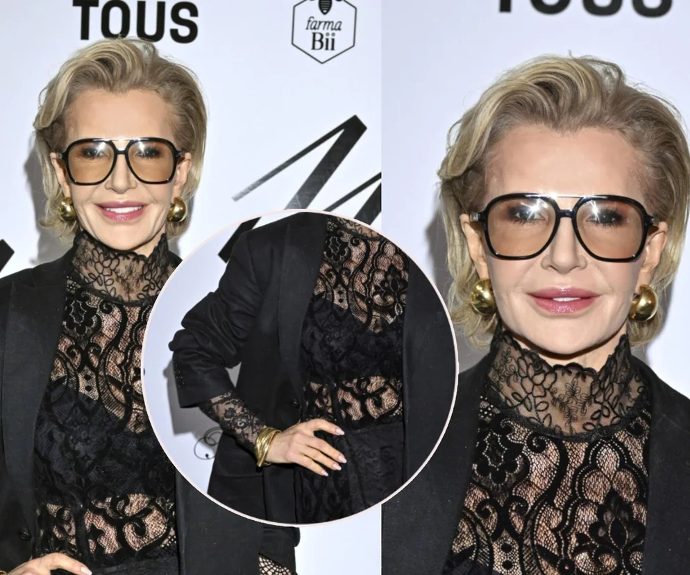 Pozostałe gwiazdy sięgnęły po sprawdzone zestawy - czarne spodnie, czarne topy, gorsety, szpilki. Racewicz wyróżniła się, bo na pokazie pojawiła się odziana w długą kreację z golfem i długimi rękawami, na którą narzuciła obszerną, czarną marynarkę. Brzmi skromnie? To tylko pozory. Wdzianko było bowiem całkiem prześwitujące i pokazało, co 52-letnia Joanna miała pod nim.