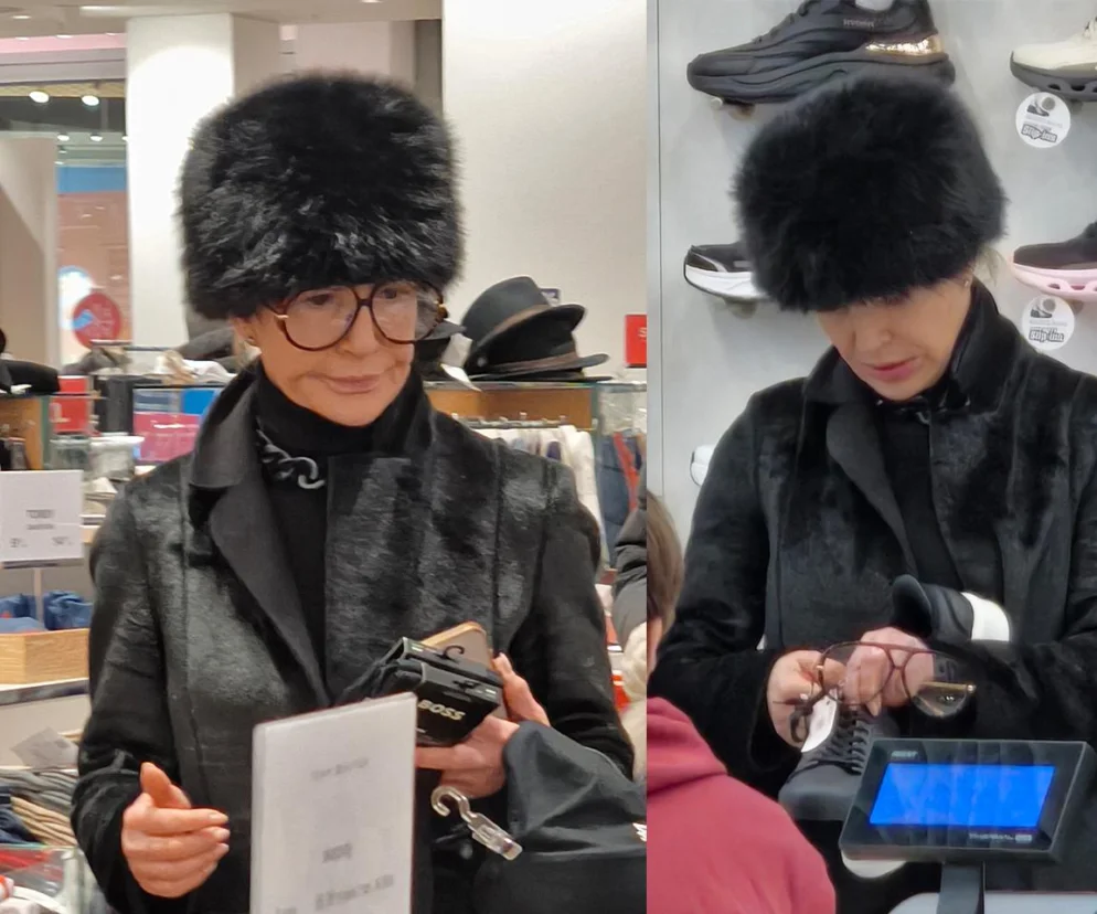 Joanna Racewicz zabrała 18-letniego syna Igora na zakupy obuwnicze. Ona sama - jak widać na zdjęciach - jest dobrze przygotowana na mrozy. Ciepły płaszcz, golf i futrzana czapa chronią ją przed aurą, ale w sklepie poszukiwała ciepłych butów.