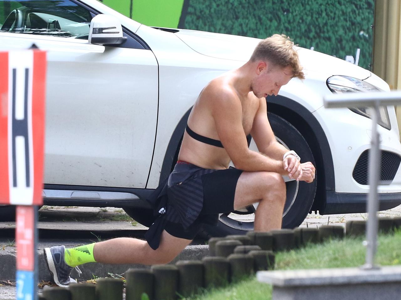I niepotrzebne były mu plaża, las ani inne miłe okoliczności przyrody - aktor pocił się na parkingu. Kucał, rozciągał się, prężył i co chwilę spoglądał na swoją klatę, czy mięśnie już się pojawiły. Kubo, coś tam już widać ;-).