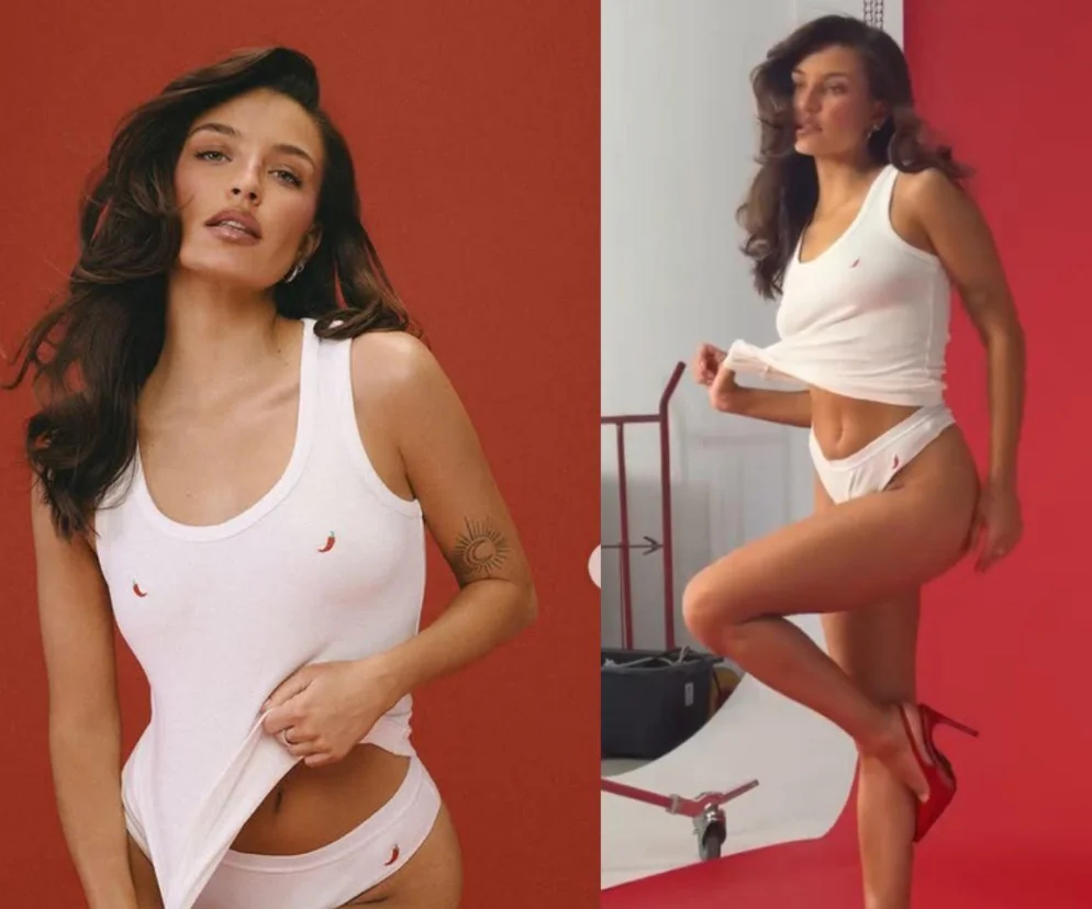 Na najnowszym zdjęciu Julia pozuje w komplecie składającym się z białych, dopasowanych majtek i prostego podkoszulka w tym samym kolorze. Jednak to nie klasyczny minimalizm przyciąga wzrok - na wysokości biustu podkoszulek został ozdobiony wyhaftowanymi czerwonymi papryczkami, które nadają całej stylizacji zabawnego, seksownego charakteru. Papryczki stanowią nieoczekiwany akcent, który jednocześnie dodaje odrobinę pikanterii i prowokacji.