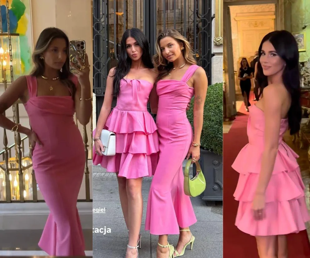 Obie gwiazdy postawiły na róż, ale każda w zupełnie innym wydaniu. Julia Wieniawa zaprezentowała dopasowaną sukienkę midi na ramiączkach, do której dobrała limonkowe sandałki na obcasie i malutką torebkę. Roksana Węgiel wybrała rozkloszowaną, krótką sukienkę bez ramiączek z falbanami, białą kopertówkę i błyszczące sandały na obcasie.