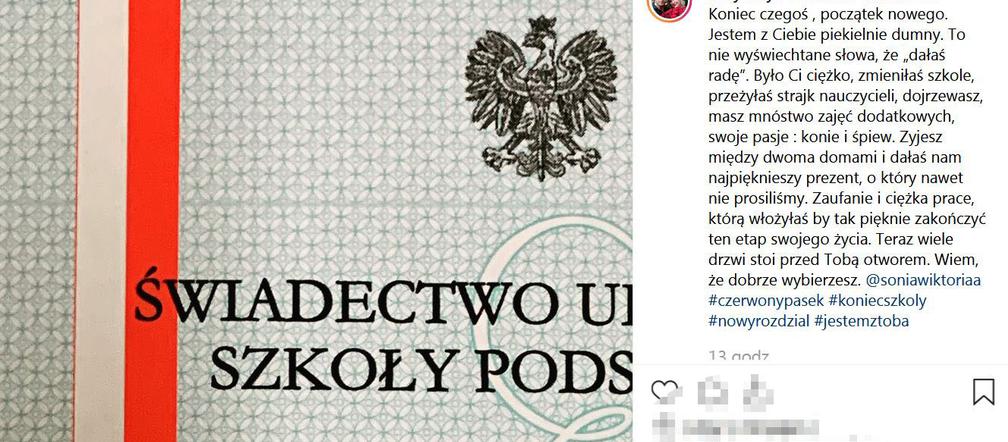 Na ripostę Borysa Szyca, nie trzeba było długo czekać. - Jeszcze pare słów o paskach. Nie tych na TVP bo te są zawsze na czerwono i nikt się nie czepia? @karolinakp poruszyła ważny temat ,czy to nie wyścig szczurów i pokazywactwa na feju, żeby się tak chwalić tym przeklętym czerwonym (czerwoni precz!) paskiem... Karolino ale trochę jednak przesadzasz. Wtedy zamiast fejsa miałaś tłum cioć, wujków, dziadków, babć,kuzynów bliższych i dalszych, sąsiadów,kumpli na trzepaku, nowych kumpli na wakacjach, nawet panie z dawnego przedszkola dopytywały się „No i jak Ci Borysku poszło”??? A nie zawsze poszło dobrze. W ósmej czerwony pasek się udał i byłem strasznie dumny , pomimo presji nauczycieli, mamy, wspomnianych cioć i wujków. Po prostu cieszyłem się ze dałem radę i widzę dumę w oczach moich bilskich. To dla dzieci bardzo ważne. Tak samo ważne jak powiedzieć, nie martw się ze nie masz czerwonego paska, dla mnie i tak zawsze będziesz najlepszy, będę Cię kochał i wspierał. I to powtarzałem Soni co roku i wiesz co? To jej pierwszy czerwony pasek, na koniec ósmej klasy, pod strajku nauczycieli, po nadrabianiu materiałów, po szaleńczym nadrabianiu materiału, po łączeniu tego ze sportem i śpiewaniem...i tak! jestem z niej piekieknie dumny i mój post ze zdjęciem (dam na koniec żeby nie epatować) tego paska to szacunek i podziękowanie dla niej. Nie łechtanie mojej próżności ani jakiś wyścig szczurów. Wspieram Was wszystkie dzieciaki, które przez niezbyt mądrych dorosłych zostaliscie wpędzeni w niezłe kłopoty i teraz brakuje dla wszystkich miejsc do szkół, liceów, techników. A pasek? Phi! Jest z niego wielka radość i duma teraz ,i to najzwyczajniej duży plus w dostaniu się do dobrego liceum...ale teraz UWAGA : zabawa na koniec...ile Wam znajdzie odnalezienie teraz, w tej chwili, waszego świadectwa z 8 klasy??? Start! - czytamy we wpisie aktora (pisownia oryginalna).