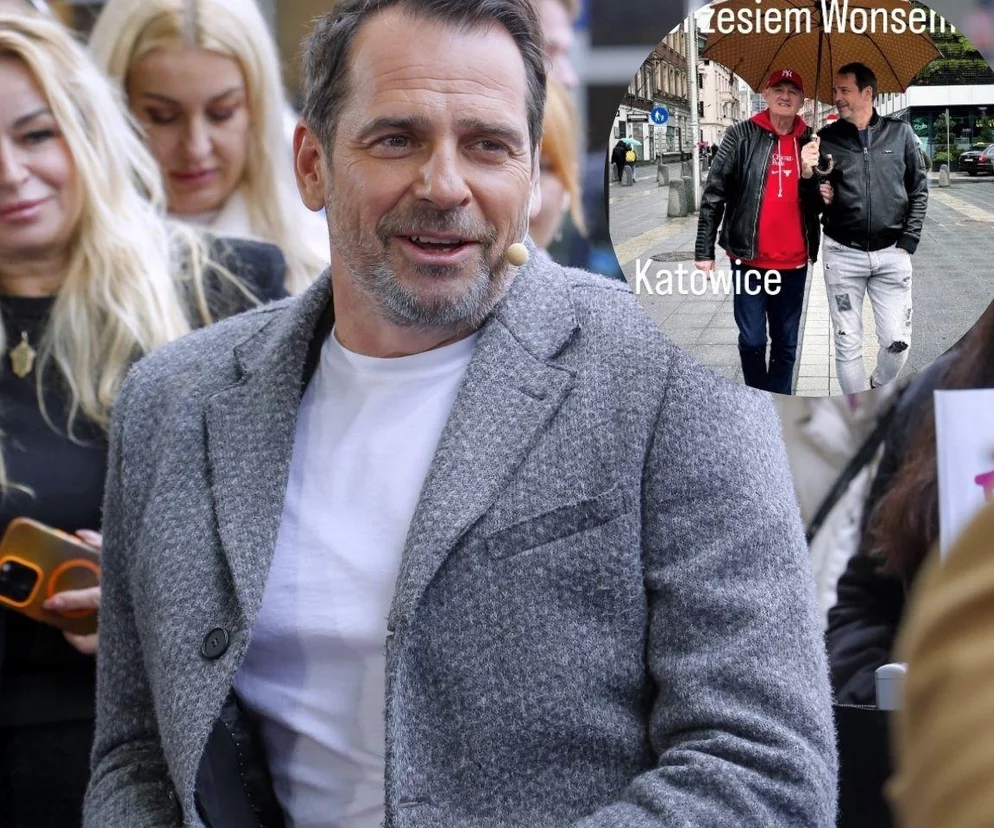 Paweł Deląg, którego znamy z kinowych hitów i seriali, jak choćby "M jak miłość", pojawił się w Katowicach w bardzo swobodnej, ale dopracowanej stylizacji. Skórzana kurtka, jasne, przecierane dżinsy i klasyczne buty - całość tworzyła luźny, ale świadomy look. U jego boku – Grzegorz Wons, aktor teatralny i filmowy, w sportowej bluzie i czerwonej czapce z daszkiem. Obaj wyglądali na zrelaksowanych i w doskonałych humorach.