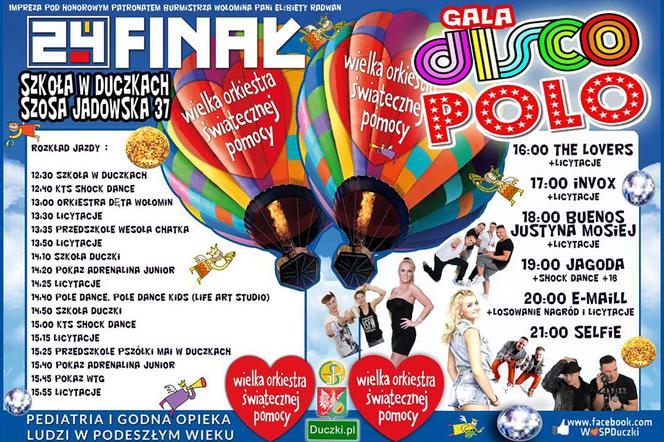 Wielka Orkiestra Świątecznej Pomocy w Duczkach to 9,5 godziny niesamowitej imprezy! Początek o 12:30 w Szkole w Duczkach. Poniżej prezentujemy szczegóły 24. Finału ze szczególnym uwzględnieniem gwiazd disco polo:
