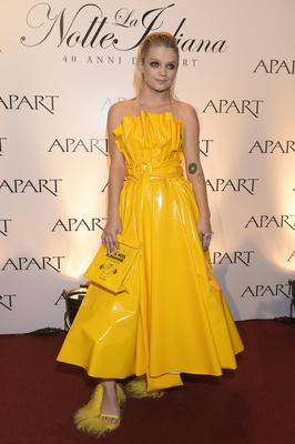 Margaret na 40-leciu marki Apart w sukience z żółtego lateksu