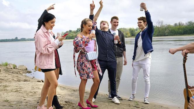Barwy szczęścia odc. 1965. Oliwka (Wiktoria Gąsiewska), Justin (Jasper Sołtysiewicz), Magda (Natalia Sierzputowska), Mia (Maria Ruddick)