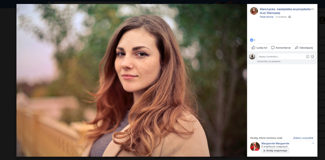 Klara Łęcka, 36-letnia matka trójki dzieci z Żoliborza, która miala jako bezpartyjna startować na prezydenta Warszawy. Okazało się, że jest to postać zmyślona przez studentów UKSW na potrzeby ich projektu.
