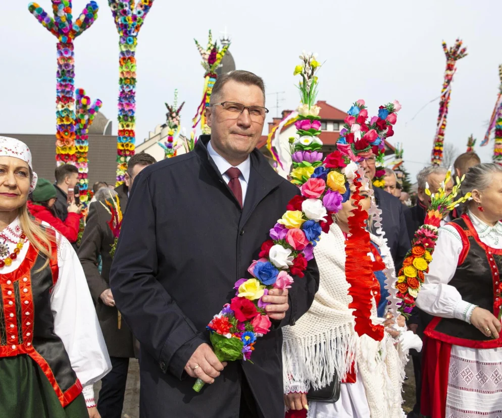 Niedziela Palmowa w Łysych w tym roku przyciągnęła szczególnego gościa. Wśród tłumów podziwiających barwne kurpiowskie palmy wielkanocne pojawił się Przemysław Czarnek - polityk Prawa i Sprawiedliwości, od niedawna oficjalny kandydat tego ugrupowania na premiera. Choć jego palemka była mniejsza niż ta Nawrockiego, zdecydowanie wyróżniała się względem niej mnogością kolorów. Czarnek wygłosił również krótkie przemówienie.