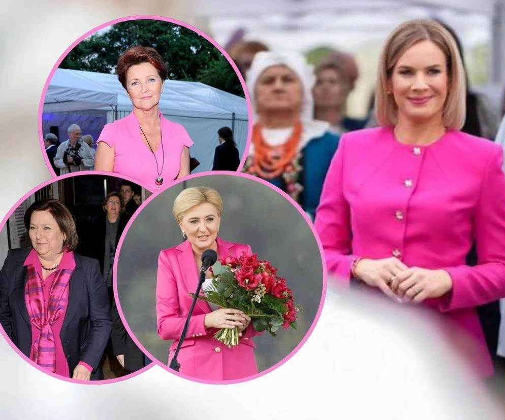 Ubrania w kolorze różowych są też często wybierane przez Martę Nawrocką. Pierwsza dama w różowych strojach chodził jeszcze w czasie kampanii wyborczej. W jej szafie można znaleźć komplet wpisujący się w tzw. sportową elegancję, czyli szerokie spodnie i kamizelka, ale też eleganckie kostiumy w mocnym różowym kolorze.
