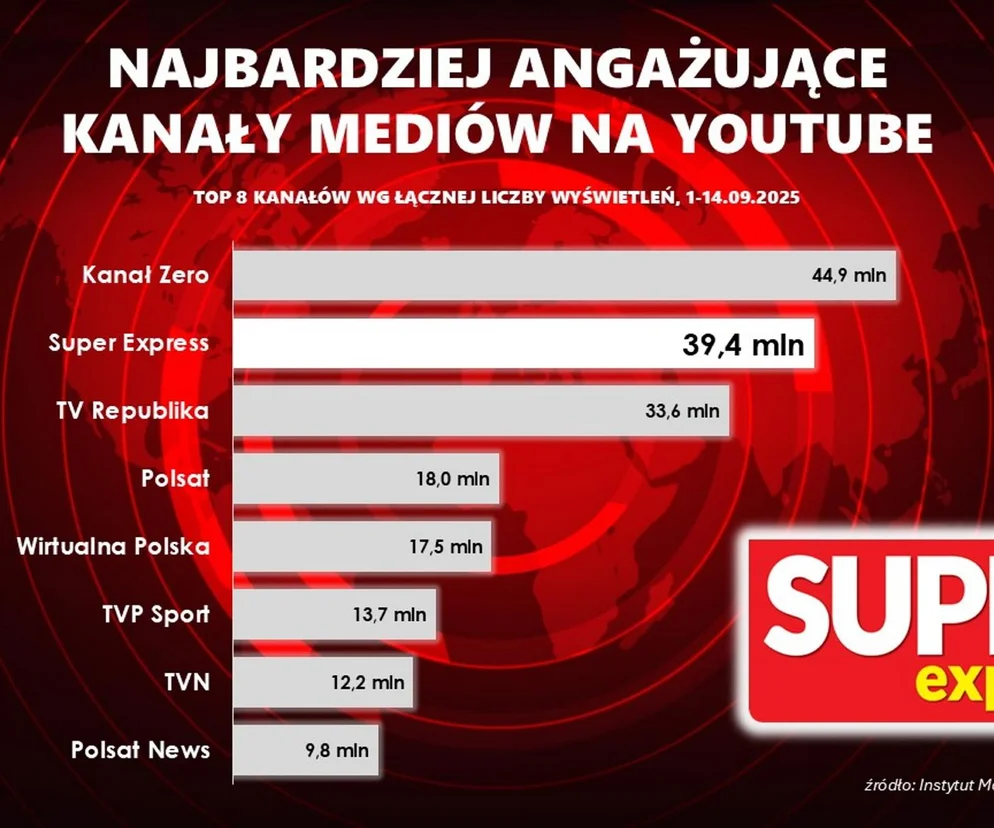 Z wielką przyjemnością przekazujemy, że "Super Express" znalazł się na 2. miejscu w rankingu najbardziej angażujących kanałów mediów na YouTubie. Kanał "Super Expressu" osiągnął wynik 39,4 mln wyświetleń, ustępując jedynie Kanałowi Zero (44,9 mln). Trzecie miejsce zajęła TV Republika z wynikiem 33,6 mln.