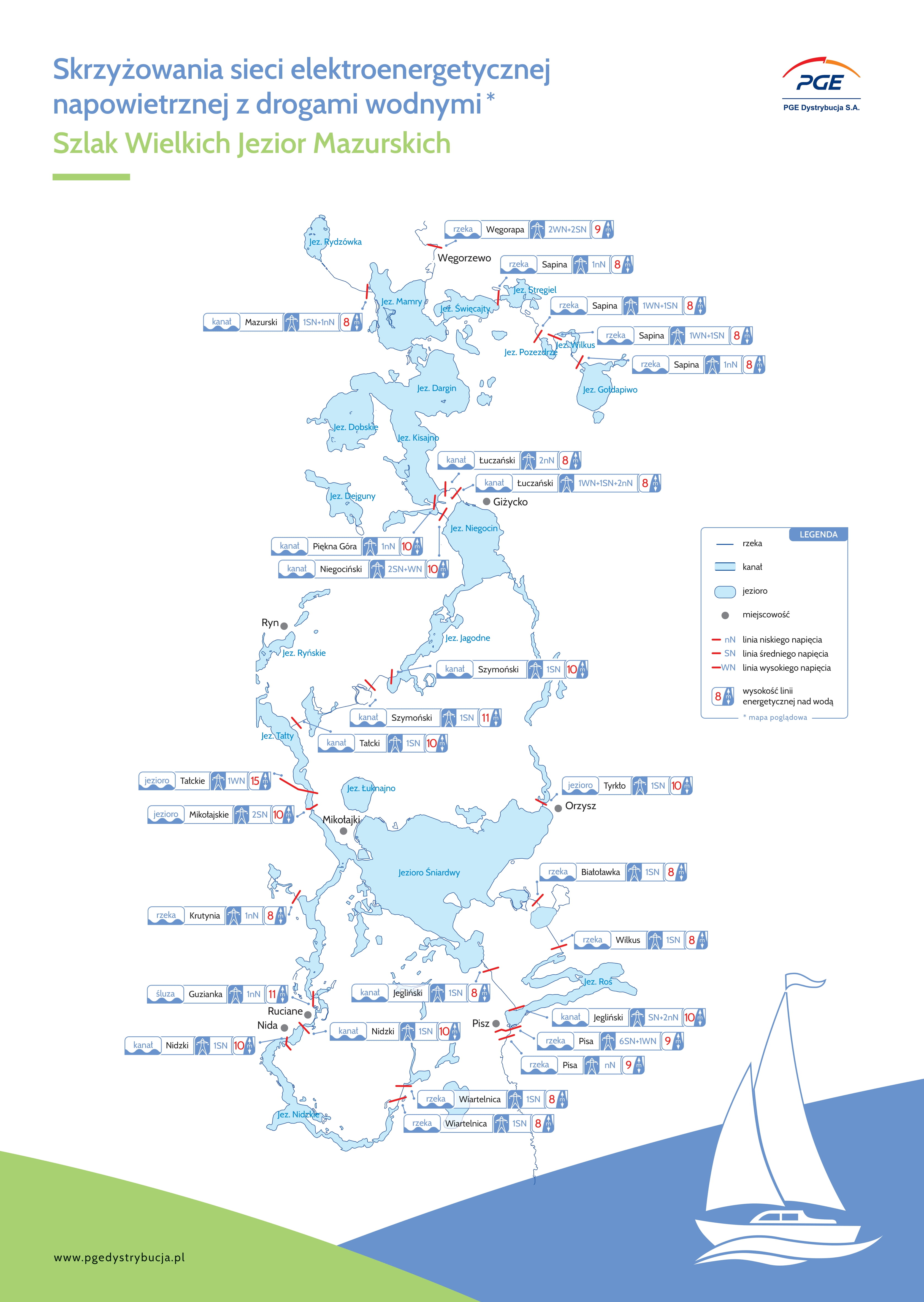 W tym celu przygotowała specjalne mapy, na których zostały zaznaczone miejsca skrzyżowań napowietrznych linii energetycznych ze szlakami wodnymi na Kanale Augustowskim i w Krainie Wielkich Jezior Mazurskich. Regiony te znajdują się na obszarze dystrybucyjnym PGE, dlatego właśnie spółka postanowiła uwrażliwić na bezpieczne zasady poruszania się na śródlądowych szlakach żeglownych. Pozwoli to żeglarzom uniknąć ryzyka zahaczenia masztem o linię energetyczną. Mapy będą kolportowane na Pojezierzu Mazurskim i na Suwalszczyźnie.