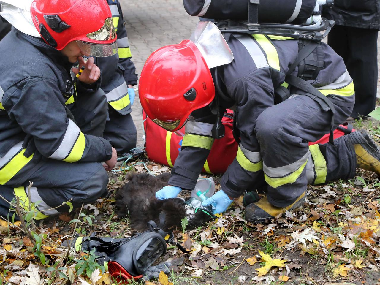 Dym wydobywający się z okna na drugim piętrze kamienicy przy ulicy Moniuszki zaalarmował sąsiadów, którzy natychmiast wezwali na pomoc strażaków. Antywłamaniowe drzwi do mieszkania, w którym wybuchł pożar okazały się zbyt trudną do sforsowania przeszkodą. Strażacy ewakuowali z wypełnionej gęstym, gryzącym w oczy i płuca dymem kamienicy siedem osób. Do okna mieszkania w którym rozszalał się pożar przystawili wysięgnikiem wozu bojowego drabinę. Z mieszkania dochodziło rozpaczliwe miauczenie. Kiedy strażacy wchodzili przez okno odgłosy stawały się już coraz cichsze. W końcu zupełnie zamilkły. W przedpokoju leżał nieprzytomny kotek. Dym wydobywający się z płomieni dosłownie zadusił przerażonego zwierzątko. W mieszkaniu nie było nikogo z lokatorów. Strażak pewnym chwytem złapał kotka. Utulił go delikatnie w silnych dłoniach i wyniósł z pożaru. Kocurek żyje tylko dzięki natychmiastowej pomocy. Strażacy nie szczędzili starań, żeby przywrócić go do życia. Masaż serca ponowił bicie kociego serduszka. Na tym nie zakończyła się jednak reanimacja. Pochyleni nad malutkim zwierzęciem strażacy zaczęli uparcie pompować powietrze w jego płuca . W końcu udało się. Kotek zaczął najpierw powoli a potem miarowo oddychać. Po kilkunastu minutach łasił się do nóg swoich wybawców.