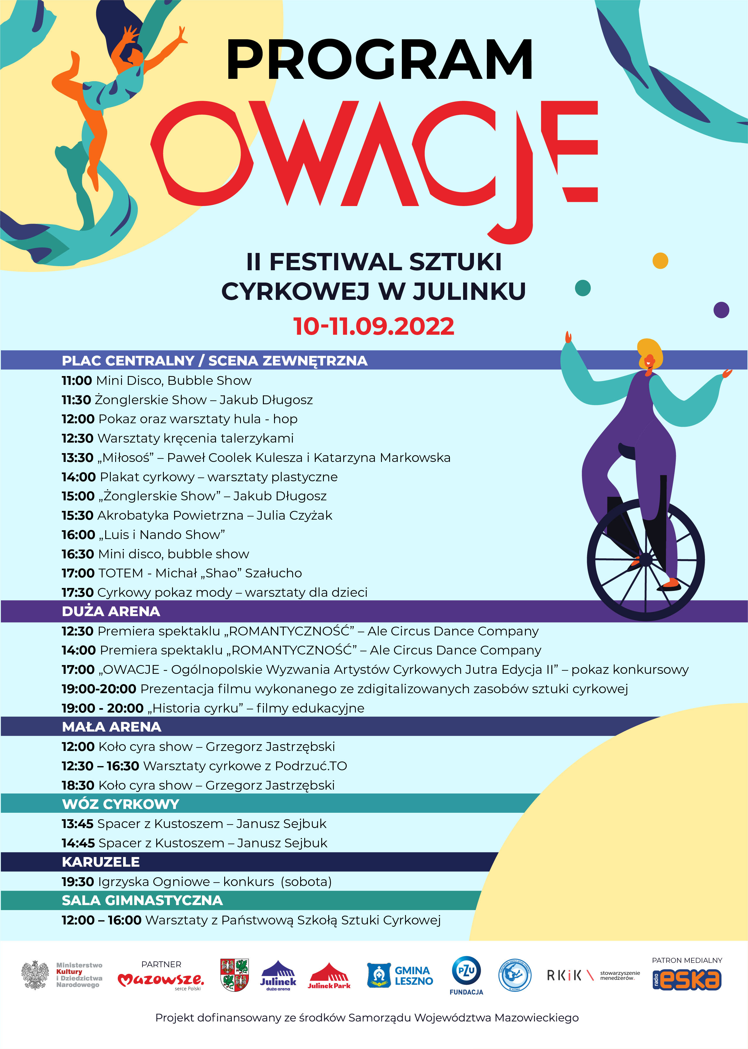 Wstęp na II edycję Festiwalu Sztuki Cyrkowej OWACJE w Julinku jest darmowy. Organizatorami festiwalu są Stowarzyszenie RKIK oraz Julinek Park. Partnerami: Samorząd Województwa Mazowieckiego, Fundacja PZU, Powiat Warszawski Zachodni, Gmina Leszno oraz Państwowa Szkoła Sztuki Cyrkowej w Julinku.