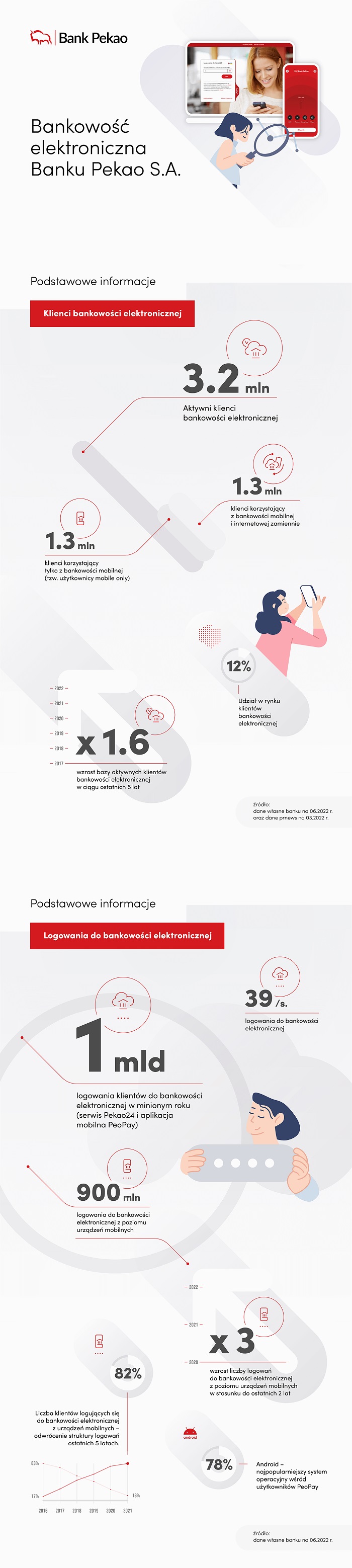 W ciągu ostatnich pięciu lat baza aktywnych w sieci klientów Banku Pekao wzrosła ponad półtorakrotnie. Szczególną popularnością cieszy się aplikacja PeoPay. Już ponad 1,3 mln klientów Pekao korzysta tylko z bankowości mobilnej. Aplikacja jest na bieżąco udoskonalana. Klienci mają możliwość korzystania także z dodatkowych modułów, takich jak inwestycje czy notowania. Mogą za pośrednictwem aplikacji kupować bilety komunikacji miejskiej oraz dokonywać opłat za parkowanie. Już ponad 160 tys. klientów aktywowało usługę płatności za parkingi i bilety komunikacji miejskiej, a ponad 100 tys. osób ma aktywowane płatności za autostrady. Klienci Banku Pekao mogą także wykonać „z kanapy” już ponad 60 proc. spośród wszystkich operacji i procesów dostępnych dla klientów indywidualnych. Nawet 50 proc. zleceń składanych przez klientów w kanałach elektronicznych dotyczy pożyczki gotówkowej. Bank Pekao dba o to, aby pożyczka była dostępna zdalnie, szybko, wygodnie i bez zbędnych formalności.