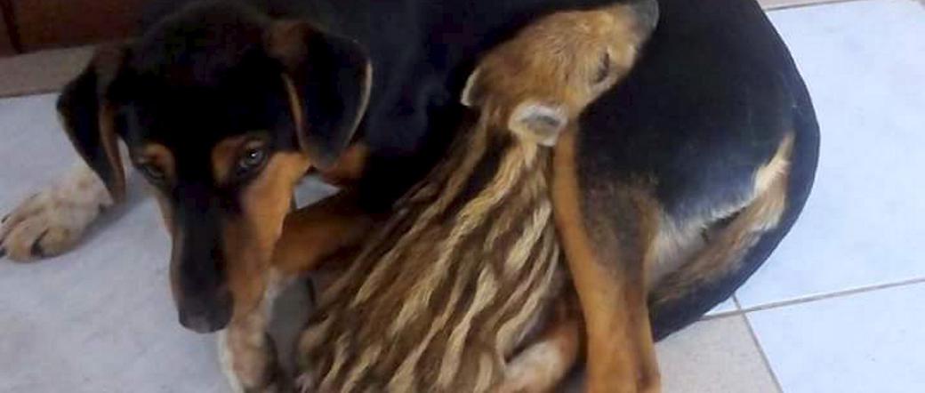 Dyzio jest w przytulisku dla zwierząt od roku. Gdy na początku marca trafiła tam błąkająca się po polach loszka, pies oszalał na jej punkcie. Frytka była wtedy kilkudniowym, wychudzonym dziczkiem, miała jeszcze pępowinę. Dyzio pomógł jej wyzdrowieć. - Przytulał się do niej, lizał, nie odchodził na krok. Gdy Frytka cierpiała z powodu biegunek, Dyzio masował jej brzuszek językiem. Dzik traktuje pieska jak matkę. Wchodzi mu pod pachę, szuka mleka - mówi Anna Kamińska z ośrodka w Jelonkach.