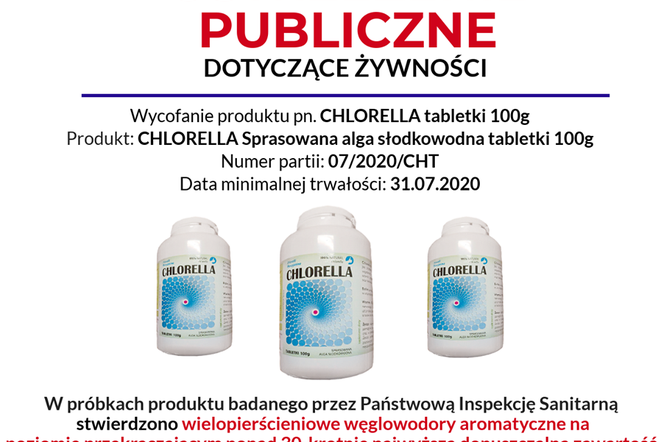 Decyzją Głównego Inspektoratu Sanitarnego z obrotu wycofana została partia sprasowanej algi słodkowodnej, której dystrybutorem jest firma AURA Herbals Jarosław Paul, z Sopotu. wyłącznie suplementu diety "chlorella sprasowana alga słodkowodna tabletki 100 g" . Chodzi partię tabletek o numerze: 07/2020/CHT, z datą minimalnej trwałości: 31.07.2020.