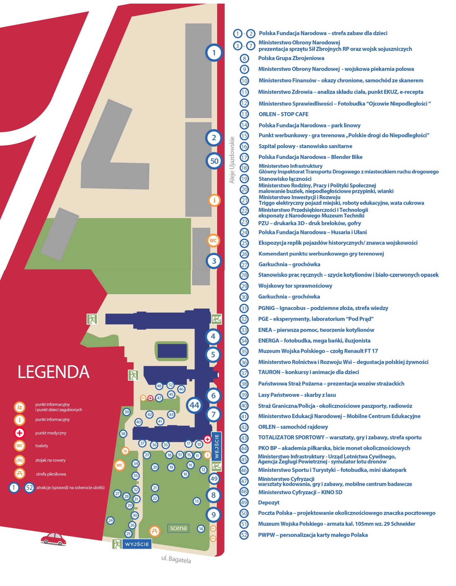 Z pewnością uwagę przyciągną stoiska spółek Skarbu Państwa i ministerstw (m.in. kino 5D, Mobilne Laboratorium Badawcze, Robot pirotechniczny, nauka kodowania – zajęcia z programowania z użyciem robotów, czy Symulator lotu dronów). Na uczestników czekać będzie też miła niespodzianka – bezpłatny obiad polowy w postaci woskowej grochówki i świeżo wypiekanego chleba. Rocznicowy wieczór zakończy się spektakularnym, największym w Polsce pokazem sztucznych ogni na bulwarach wiślanych! –Pragniemy, by tę niezwykłą rocznicę uczcić równie niezwykłym widowiskiem, bo taka niepowtarzalna chwila zdarza się tylko raz na sto lat, właśnie dziś, 11 listopada 2018 roku. Ztej okazji w imieniu Polskiej Fundacji Narodowej zapraszam Państwa na wspaniały pokaz, który uświetni setne urodziny Niepodległej – zachęca Filip Rdesiński, prezes PFN.