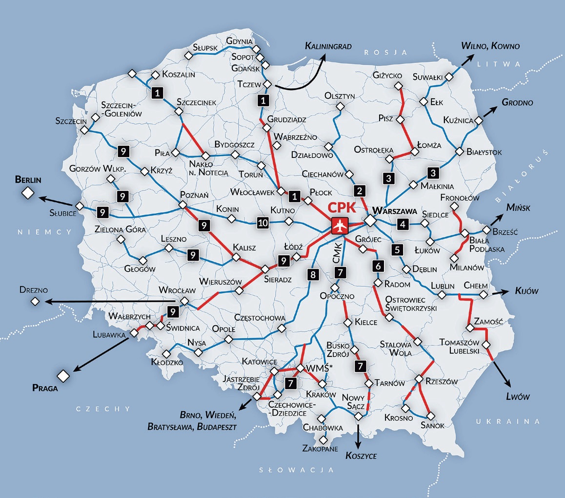 Spółka Centralny Port Komunikacyjny ma już opracowanie z mapami nowych linii kolejowych prowadzących z różnych stron Polski do CPK. CPK to nowe, największe w Europie Środkowo-Wschodniej lotnisko, które powstanie między Warszawą i Łodzią oraz gigantyczne skrzyżowanie linii kolejowych. To stąd będą się rozchodzić szlaki kolejowe we wszystkich kierunkach – niczym szprychy w kole rowerowym. Dzięki nowym i zmodernizowanym liniom kolejowym mieszkańcy 120 polskich miast i wielu miast poza granicami naszego kraju zyskają bezpośrednie połączenie z CPK i Warszawą.