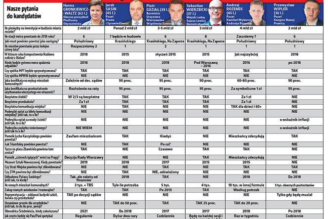 W ogniu pytań "Super Expressu" znaleźli się Hanna Gronkiewicz-Waltz, Jacek Sasin, Piotr Guział, Sebastian Wierzbicki, Andrzej Rozenek i Przemysław Wipler. Niektórzy gwarantują bezpłatne żłobki, inni rozważają budowę Łuku Triumfalnego. Wszyscy zapewniają, że powstaną nowe mosty, a jeden z polityków obiecał nawet bezpłatną komunikację miejską! Co jeszcze oferują tegoroczni kandydaci na prezydenta Warszawy? Zajrzyj do naszej infografiki, którą znajdziesz w powyższej galerii.