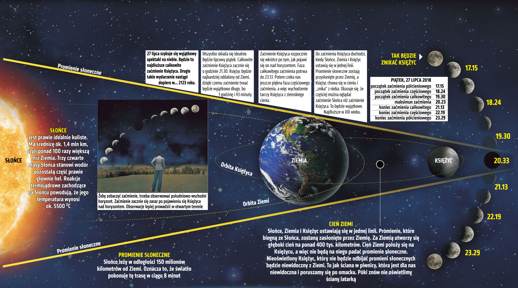 Dzieje się tak, gdy satelita Ziemi, nasza planeta i Słońce ustawiają się w jednej linii. Ziemia przysłania promienie słoneczne i Księżyc znajduje się w cieniu, stąd wrażenie, że znika z nieba. Gdy zacznie się chować, może nam się wydawać, że jest czerwonawy lub bardzo duży, to zjawisko Superksiężyca. Oczywiście ten kosmiczny spektakl będziemy mogli obserwować tylko wtedy, jeśli dopisze pogoda. Na szczęście prognozy dla są korzystne, jedynie na wschodzie chmury mogą pokrzyżować astronomiczne plany. Najlepsza widoczność będzie nad morzem!