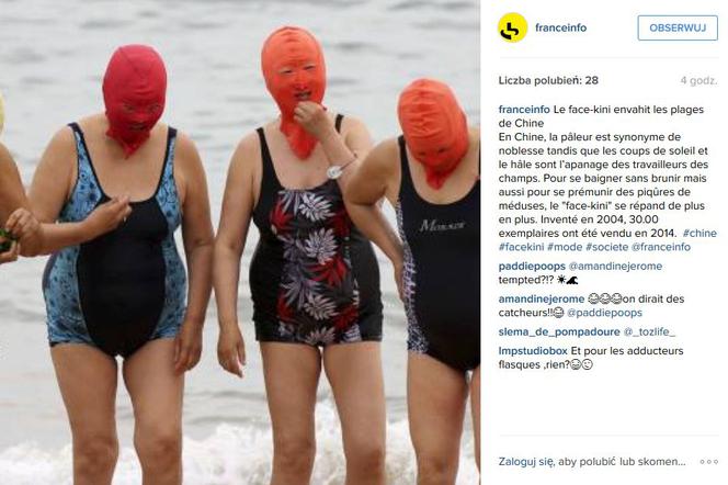 Olejki i balsamy do opalania, które mają chronić przed nadmiernym promieniowaniem słonecznym, to przesłość. Teraz w Azji nosi się facekini. Co to jest facekini? Nazwa powstała od połączenia słów: „face”, czyli twarzy i bikini. W dużym skrócie, facekini to specjalna maska ochronna na twarz. Jej zadaniem jest ochrona twarzy osób wypoczywających na plaży przed promieniami słonecznymi i oparzeniami meduz. Na Instagramie pojawia się coraz więcej zdjęć kobiet, które noszą facekini. Myślicie, że facekini to chwilowa moda tylko w Azji, a może facekini niedługo zaleje Europę? Czekamy aż na bałtyckich plażach pojawią się takie potwory...