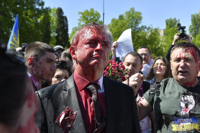 Ambasador Rosji Siergiej Andriew oblany sokiem z buraka przez aktywistów w 2022r.