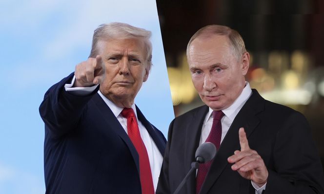 Donald Trump wskazujący palcem i Władimir Putin podczas wystąpienia, symbolizujący napięcia geopolityczne oraz presję USA na Europę w sprawie sankcji na rosyjską ropę, o czym czytaj na portalu Super Biznes.