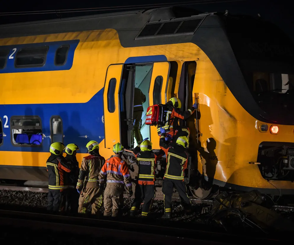 Pociągiem pasażerskim, złożonym z piętrowych wagonów, jechało od 50 do 60 osób. W wyniku zderzenia z dźwigiem kolejowym pozostawionym na szlaku, do którego doszło około 3:30 nad ranem, pierwszy wagon wykoleił się, a ostatni zaczął płonąć. Pożar ugaszono. - Przedni wagon nocnego pociągu relacji Lejda-Haga wykoleił się i wjechał w pole. Drugi z wagonów przewrócił się na bok, a w jeszcze kolejnym wybuchł pożar, który został szybko opanowany - poinformowała agencja prasowa ANP.