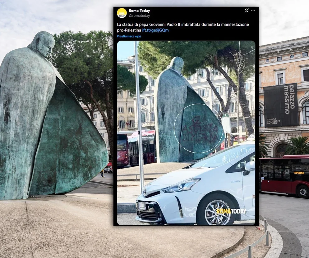 Pomnik Jana Pawła II w Rzymie na celowniku wandali. Statua stojąca w rejonie dworca Termini w stolicy Włoch została pomazana farbą. Ktoś namalował na figurze napis „faszystowskie g**no” wraz z symbolem sierpa i młota. „Nie ma słów, które mogłyby potępić profanację pomnika Świętego Jana Pawła II na rzymskim dworcu Termini przez lewicowych ekstremistów podczas niedawnego strajku i demonstracji. Dość nienawiści! Dość złych nauczycieli” – skomentował wicepremier i minister spraw zagranicznych Antonio Tajani w X. Miał na myśli fakt, iż wcześniej w tym rejonie odbywały się demonstracje poparcia dla ludności Strefy Gazy. Póki co jednak nikt nie przyznał się do umieszczenia wulgarnego napisów na pomniku. Wandalizm potępiła także premier Włoch Giorgia Meloni, podobnie polska ambasada w Rzymie. Jej pracownicy podkreślili, że „z głębokim oburzeniem przyjęli wiadomość o akcie wandalizmu” i przypomnieli, iż Jan Paweł II "nie ustawał w apelach o dialog i rozwiązania pokojowe - zarówno wobec społeczności międzynarodowej, jak i w odniesieniu do samego narodu palestyńskiego”.