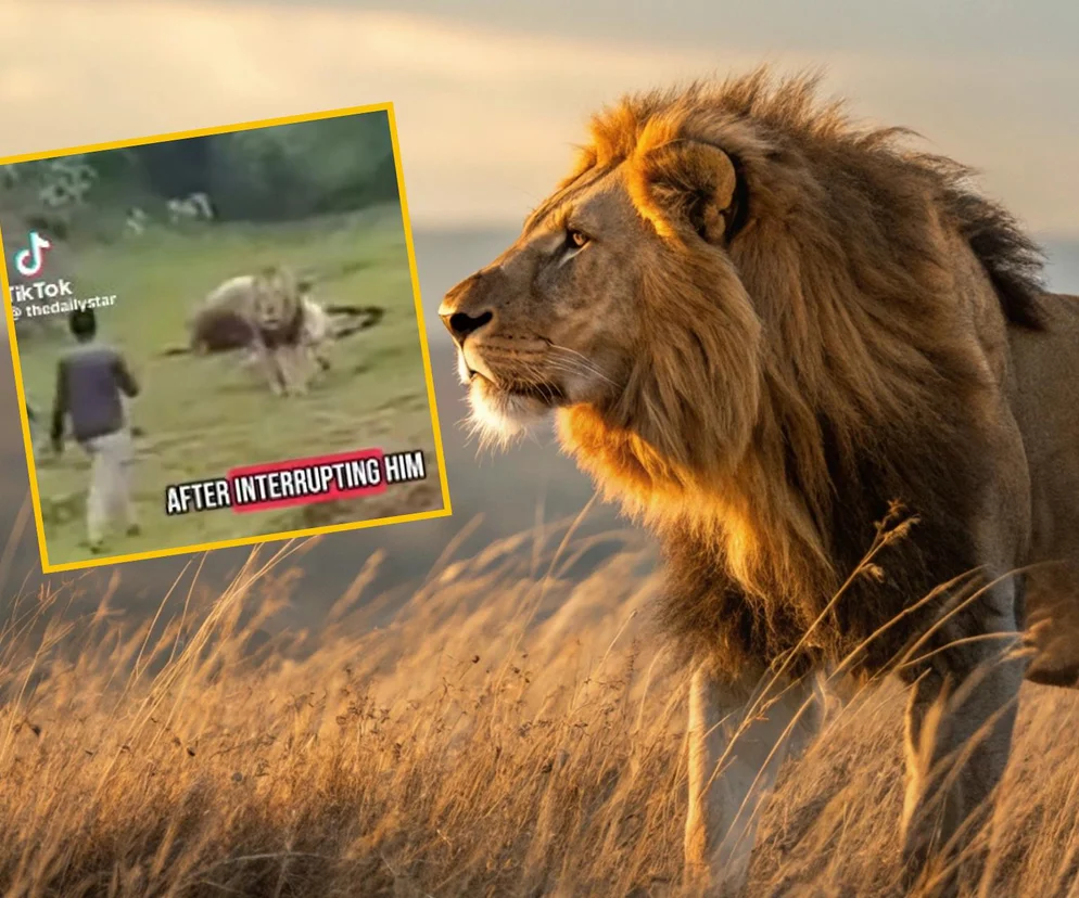 Na filmie widzimy, jak zdenerwowany lew odrywa się od posiłku i rzuca się w stronę turysty z telefonem