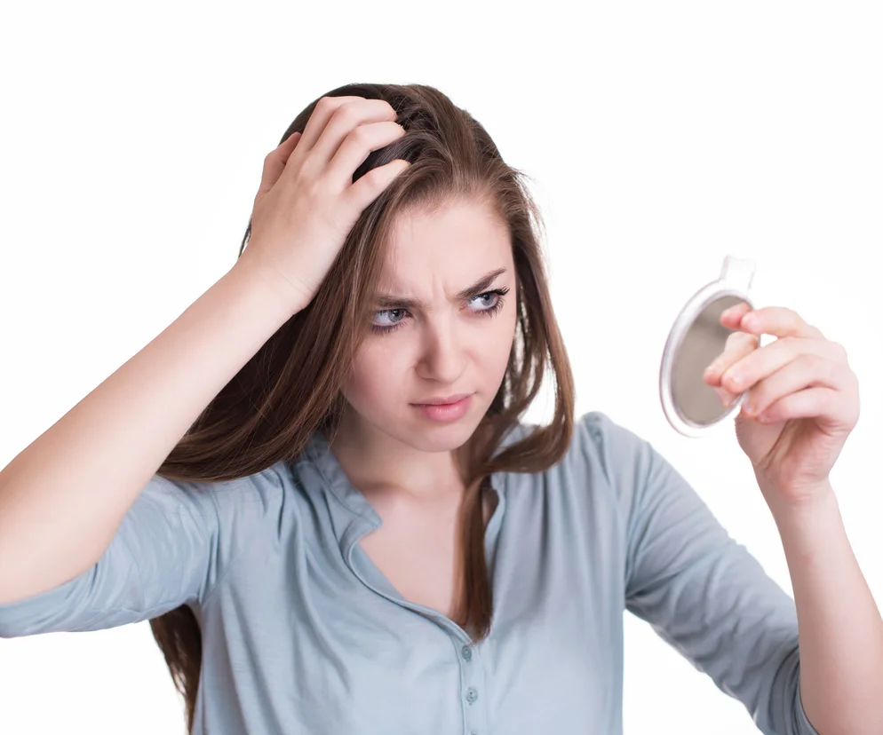 Autor: thinkstockphotos.com/ Archiwum prywatne Kobieta w błękitnej bluzce z długimi włosami, zaniepokojona ogląda się w lusterku, dłonią dotykając włosów nad czołem, co może symbolizować problemy ze skórą głowy lub włosami, takie jak łupież. Na Poradnik Zdrowie znajdziesz informacje o przyczynach i leczeniu łupieżu rumieniowego.